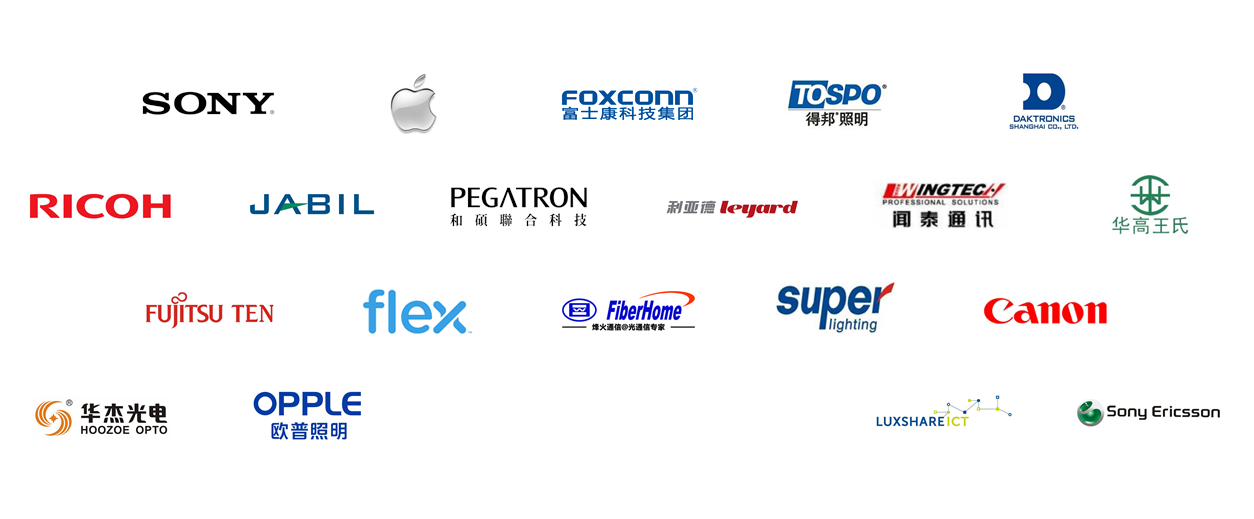 DVD組裝老化生產線、二次電源柔性生產線、變頻器組裝線、UPS組裝生產線、大型物流回收輸送線及各類型表面貼裝周邊設備